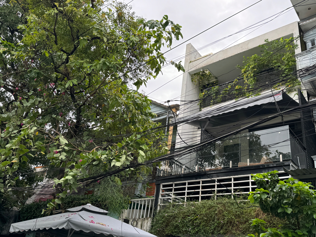 Dây điện, cáp mạng chằng chịt và bị sà xuống thấp trước dãy nhà 42-48 Bà Triệu. Đề nghị xử lý sớm để tránh gây nguy hiểm.