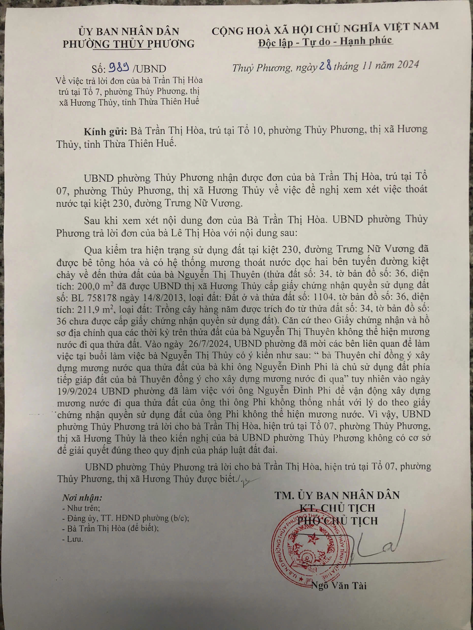 Theo phản ánh Huế S và đơn kiến nghị của bà Trần Thị Hòa UBND phường đã chỉ đạo Bộ phận địa chính - xây dựng kiểm tra hiện trạng sử dụng đất tại kiệt 230, đường Trưng Nữ Vương đã được bê tông hóa và có hệ thống mương thoát nước dọc hai bên tuyến đường kiệt chảy về đến thửa đất của bà Nguyễn Thị Thuyên (thửa đất số: 34, tờ bản đồ số: 36, diện tích: 200,0 m2 đã được UBND thị xã Hương Thủy cấp giấy chứng nhận quyền sử dụng đất số: BL 758178 ngày 14/8/2013, loại đất: Đất ở và thửa đất số: 1104, tờ bản đồ số: 36, diện tích: 211,9 m2, loại đất: Trồng cây hàng năm được trích đo từ thửa đất số: 34, tờ bản đồ số: 36 chưa được cấp giấy chứng nhận quyền sử dụng đất). Căn cứ theo Giấy chứng nhận và hồ sơ địa chính qua các thời kỳ trên thửa đất của bà Nguyễn Thị Thuyên không thể hiện mương nước đi qua thửa đất. Vào ngày 26/7/2024, UBND phường đã mời các bên liên quan để làm việc tại buổi làm việc bà Nguyễn Thị Thủy có ý kiến như sau: “ bà Thuyên chỉ đồng ý xây dựng mương nước qua thửa đất của bà khi ông Nguyễn Đình Phi là chủ sử dụng đất phía tiếp giáp đất của bà Thuyên đồng ý cho xây dựng mương nước đi qua” tuy nhiên vào ngày 19/9/2024 UBND phường đã làm việc với ông Nguyễn Đình Phi để vận động xây dựng mương nước đi qua thửa đất của ông thì ông Phi không thống nhất với lý do theo giấy chứng nhận quyền sử dụng đất của ông Phi không thể hiện mương nước. Vì vậy, UBND phường Thủy Phương trả lời cho bà Trần Thị Hòa, hiện trú tại Tổ 07, phường Thủy Phương, thị xã Hương Thủy là theo kiến nghị của bà UBND phường Thủy Phương không có cơ sở để giải quyết đúng theo quy định của pháp luật đất đai. (Đính kèm công văn trả lời đơn)