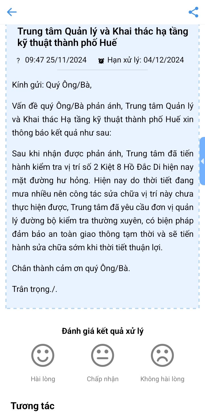 Vấn đề quý Ông/Bà phản ánh, Trung tâm Quản lý và Khai thác Hạ tầng kỹ thuật thành phố Huế (Trung tâm) xin thông báo kết quả như sau: