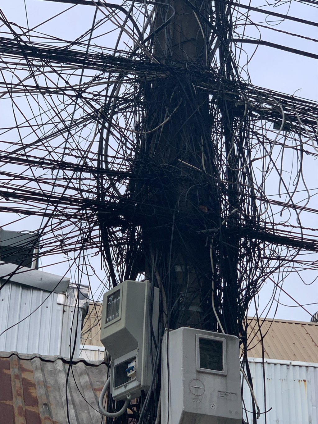 Dây điện, cáp viễn thông búi thành búi to, bắt lằng nhằng chằng chịt, gây nguy hiểm tại cột điện nhà số 9/198 Phan Chu Trinh.