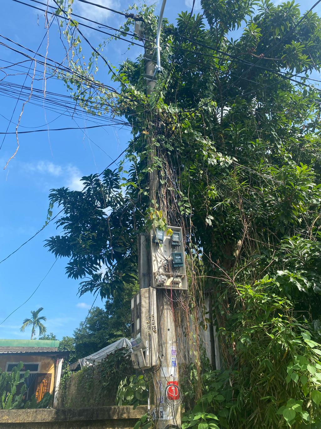 Kiến nghị sửa chữa hộp điện bị mất nắp và cây mọc trên cột điện trước mặt nhà số 2, xóm 4, thôn Ngọc Anh, phường Phú Thượng, TP Huế.