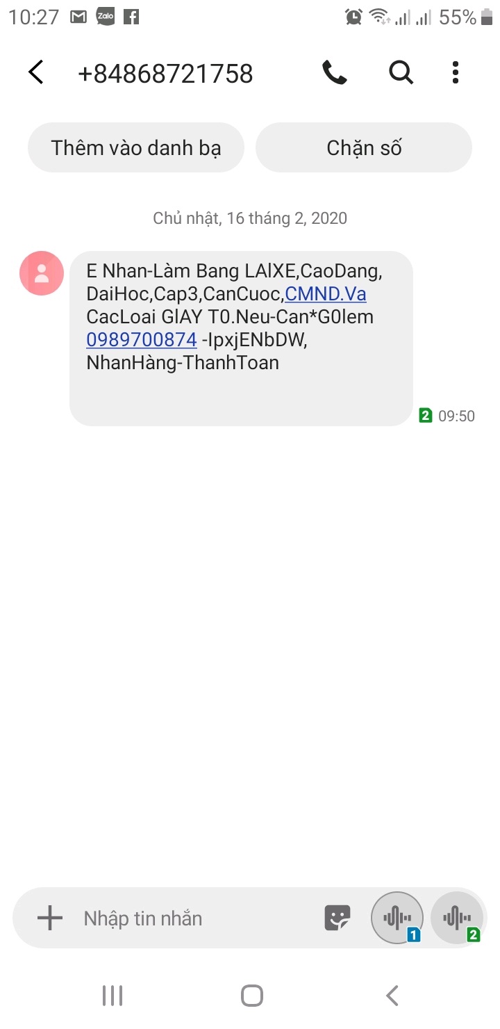 Quảng cáo làm văn bằng giả vào tin nhắn điện thoại. Đề nghị cơ quan chức năng có biện pháp xử lí.