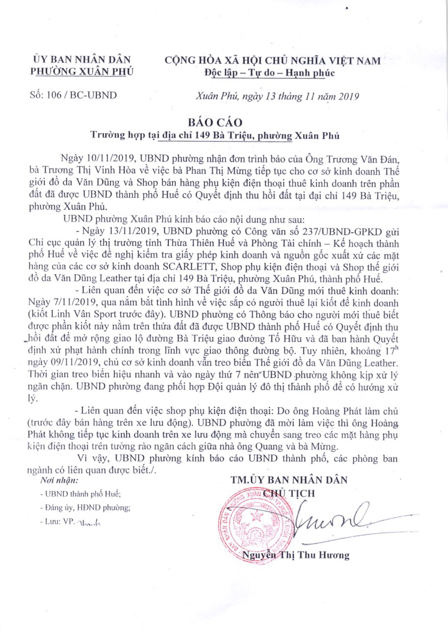 Vấn đề Ông/Bà phản ánh, Cục Quản lý thị trường tỉnh Thừa Thiên Huế đã chỉ đạo Đội Quản lý thị trường số 2 xác minh, xử lý. Ngày 28/2/2020 Đội Quản lý thị trường số 2 đã tiến hành thẩm tra xác minh tại 149 Bà Triệu, TP Huế với kết quả như sau: