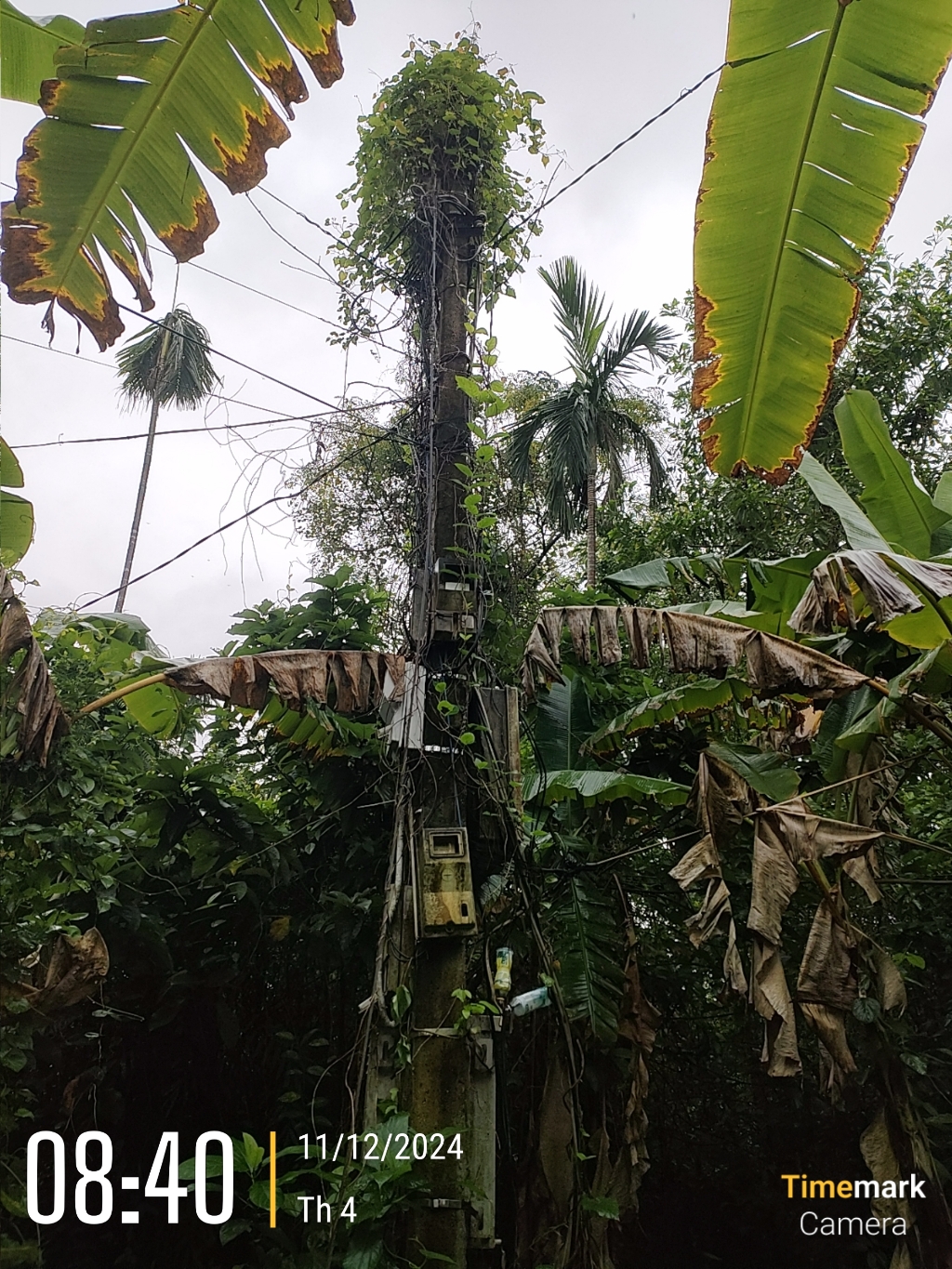 Trụ điện tại kiệt 5 TDP Công Lương phường Thủy Vân bị đứt dây néo, cây xanh leo bám trên trụ điện gây nghiên trụ nguy hiểm không đảm bảo an toàn điện trong mùa mưa bão.