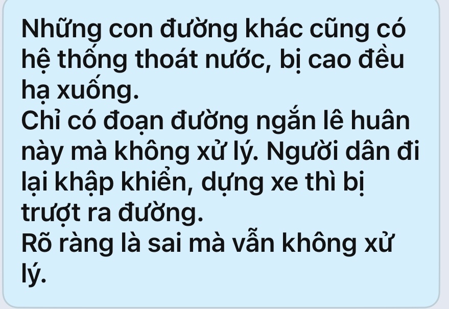 Xin ghi nhận ý kiến đóng góp, tại vị trí phản ánh vỉa hè có dốc hơn(cục bộ) do khi hạ lề gặp phải hệ thống thoát nước bên dưới, rất mong nhận được sự đồng thuận của các hộ dân sống trteen tuyến.