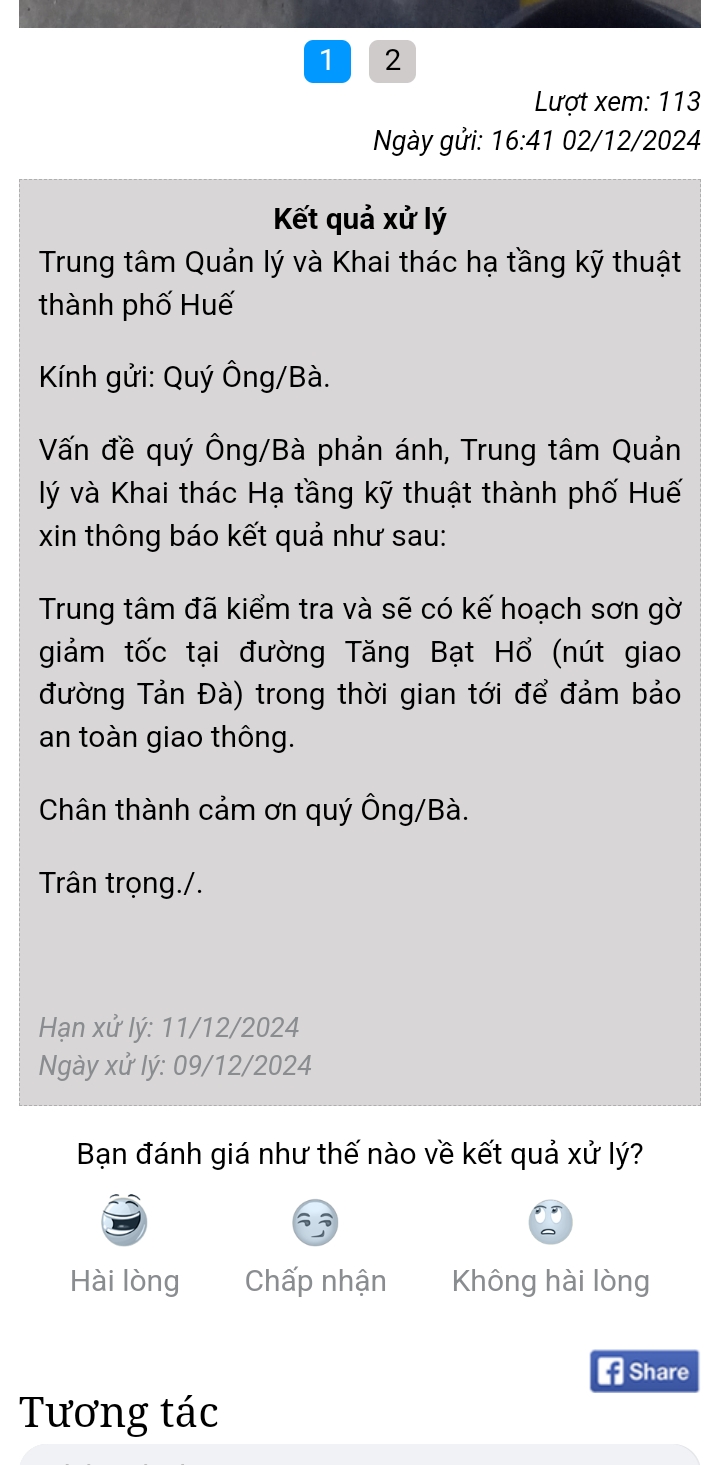 Vấn đề Quý Ông/Bà phản ánh, Trung tâm Quản lý và Khai thác Hạ tầng kỹ thuật thành phố Huế xin thông báo kết quả như sau: