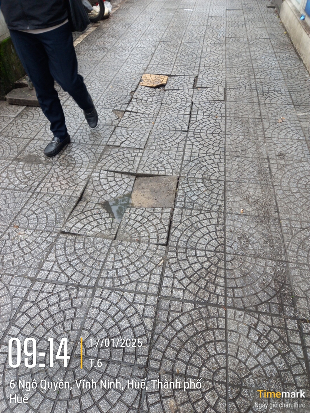 Vỉa hè bị sụt lún ở trước nhà thuốc số 6 Bệnh viện trung ương Huế số 3 Ngô Quyền, phường Vĩnh Ninh, quận Thuận Hóa. Kính gửi xử lý. Xin cảm ơn.
