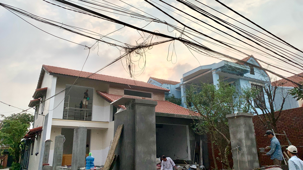 Dây của các công ty viễn thông chằng chịt trước nhà dân (địa chỉ số 9/245 Phạm Văn Đồng, Lại Thế, Phú Thượng, Thuận Hóa, TP Huế)