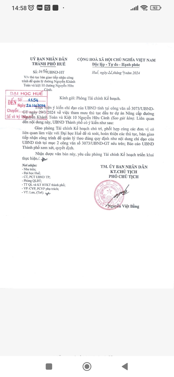 Năm 2024 đã được UBND thành phố giao cho phòng tài chính phối hợp với các phòng ban và ĐH Huế để lên kế hoạch thực hiện nâng cấp đoạn đường này. Vậy cho tôi hỏi đến nay đã có kế hoạch lúc nào thực hiện nâng cấp đoạn đường này chưa vậy?