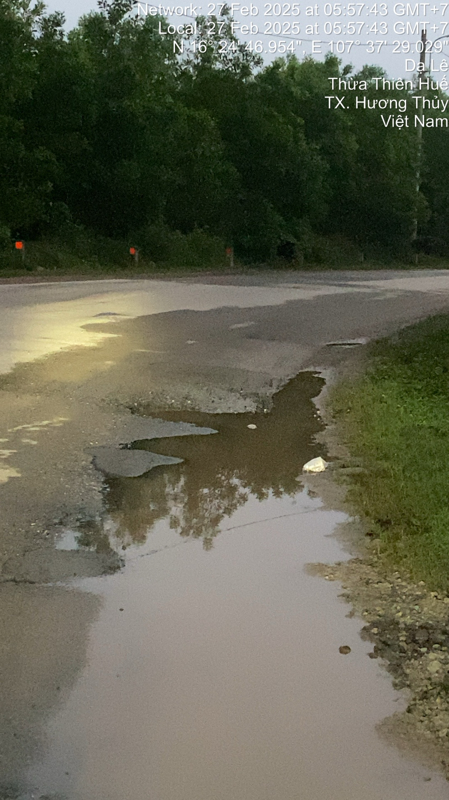 tình trạng tuyến đường Dạ Lê của phường Thủy Phương, bị hư hỏng nhiều vị trí từ đoạn cầu Ông Bang đến đoạn nhà máy gạch tuynel số 3 là những lỗ thủng giữa mặt đường và hai bên lề đường rất nguy hiểm dễ xảy ra tai nạn. Kính gửi cơ quan chức năng xử lý sớm cho bà con nhân dân đi lại thuận tiện. Có hình ảnh chụp hiển thị ngày giờ lúc 5h57 phút sáng ngày 27 tháng 02 năm 2025. Xin chân thành cảm ơn.