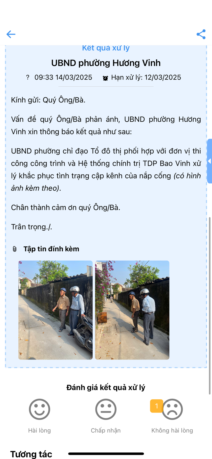 Theo như phản ánh gửi ngày 1/3/2025 thì miệng nắp cống phát tiếng kêu trước số nhà 103/18 Bao Vinh, phường Hương Vinh. Phản ánh được tiếp nhận và hẹn 12/3/2025 xử lý nhưng đến hiện tại là ngày 15/3/2025 vẫn chưa được xử lý?