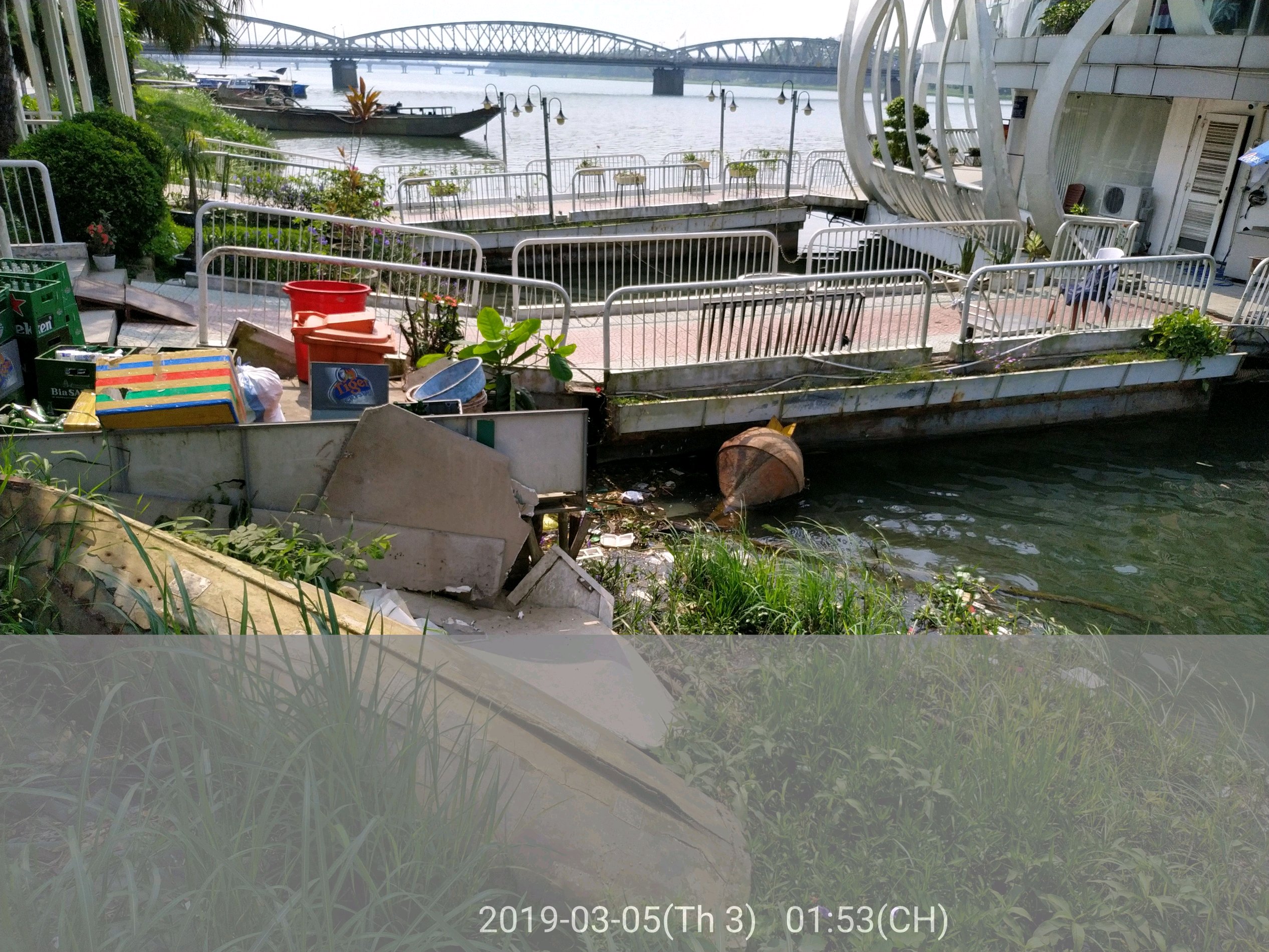 - Đối với đoạn bờ sông khu vực nhà hàng nổi Sông Hương do bị vướng cầu phao dẫn vào nhà hàng, các dây neo của nhà hàng và các thuyền rồng đậu đỗ, nên thuyền của vớt rác của Công ty không vào được. Công ty chỉ vớt được phía bên ngoài.