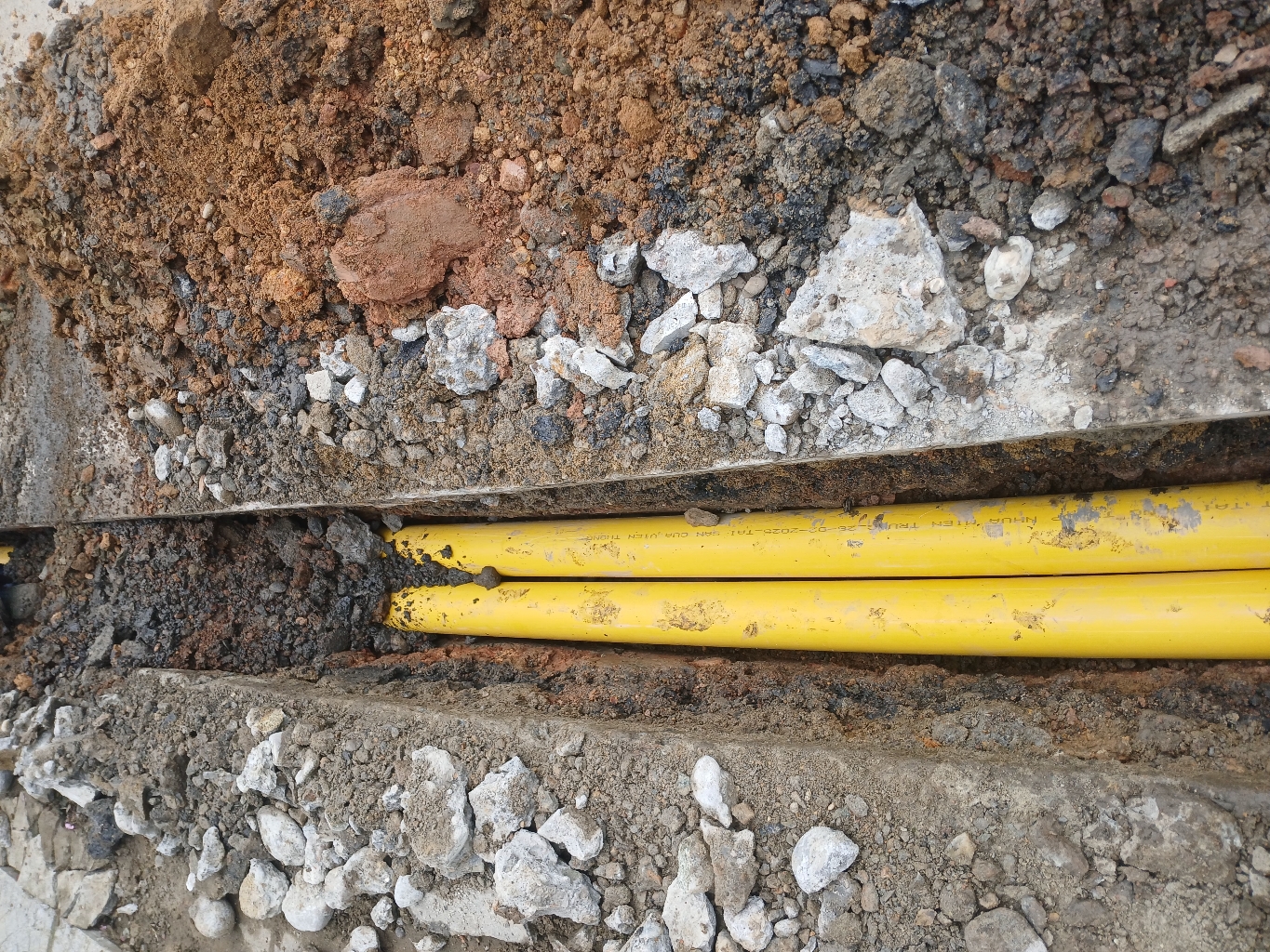 Tuyến cáp quang mobiphone thi công tuyến đường Mai Lão Bạng và Đốc Sơ, Phường An Hòa, TP Huế thả ống nhựa phi 100 cách hộ móng đào 10cm. Xong rồi đổ đất sau này trời mưa đất lún lọt xuống khe đường lún. Yêu cầu đội thi công xử lý lại.