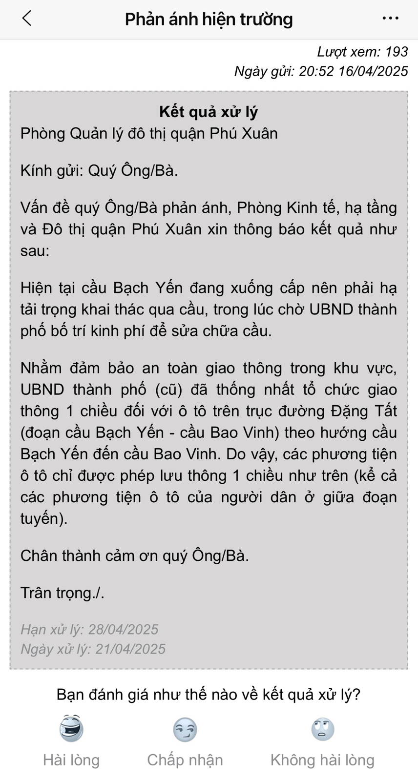 Vấn đề Ông/Bà phản ánh, Phòng Kinh tế, hạ tầng và Đô thị quận Phú Xuân xin thông báo kết quả như sau: