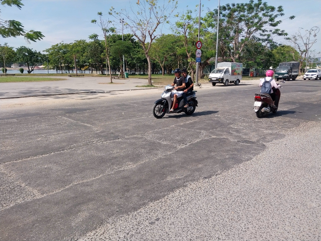 Cách cầu Nguyễn Hoàng khoảng 100m, mặt đường Kim Long có nhiều nơi bị chắp vá tạo nên độ gồ ghề. Mặt đường nhiều nơi bị trơ sỏi đá, ổ gà, rất mất thẩm mỹ và ảnh hưởng đến sự lưu thông của người dân, nhất là khu vực gần cây cầu rất đẹp.