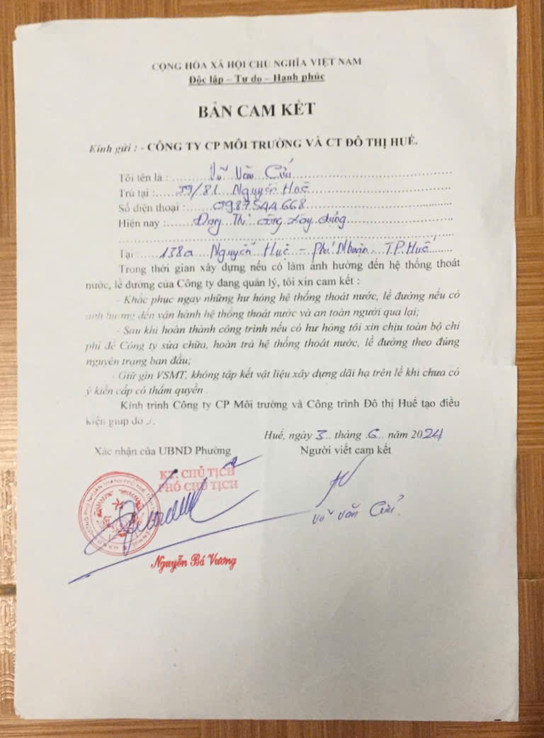 Vỉa hè tại số 138 Nguyễn Huệ hư hỏng nguyên nhân do hộ gia đình ông Vũ Văn Cửu địa chỉ 138a Nguyễn Huệ đang thực hiện việc thi công xây dựng nhà đã làm hư hỏng vỉa hè, nội dung này chủ nhà đã có cam kết với UBND Phường Phú Nhuận về việc khắc phục sửa chữa các hư hỏng gây ra (Đính kèm bảng cam kết).