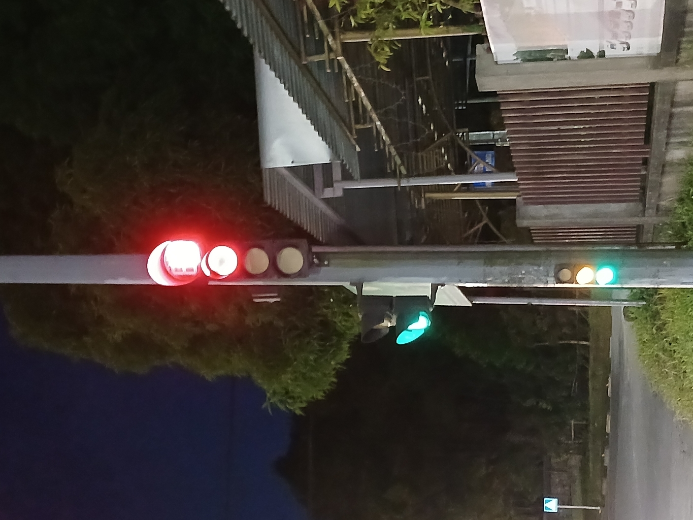 Đề nghị cơ quan chức năng cho sửa chữa hệ thống đèn giao thông tại ngã 3 đường Lê Ngô Cát và Minh Mạng. Đèn phía trên thì màu đỏ, đèn phía dưới thì màu xanh và vàng. Ảnh chụp tối ngày 02/6/2025.