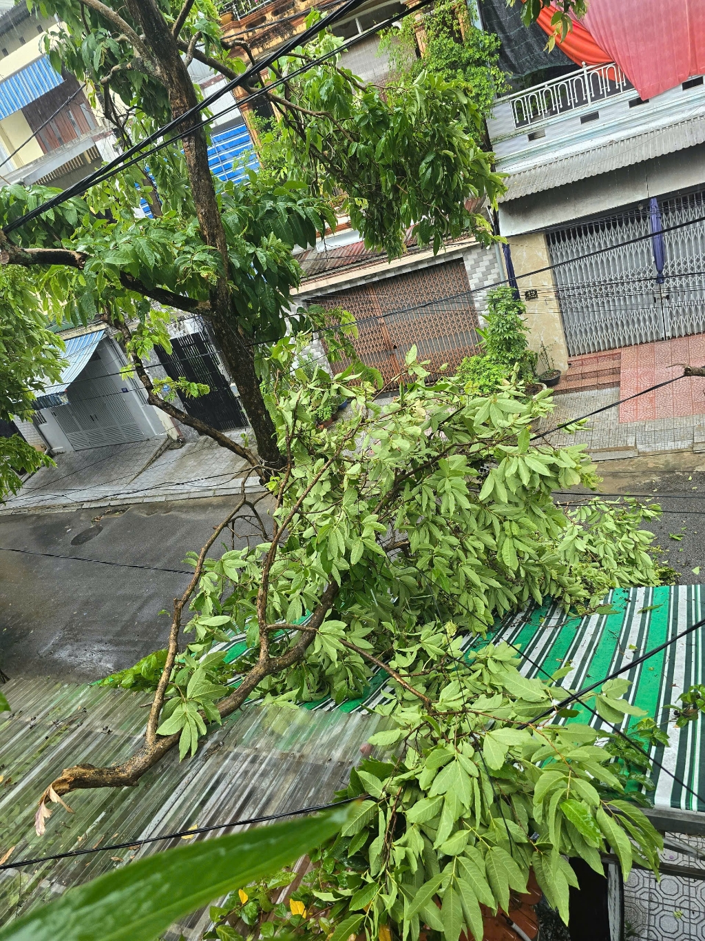 Mưa gió làm gãy cây xanh tại nhà số 40 Nguyễn Phong Sắc vướng vào đường dây điện, cáp viễn thông.