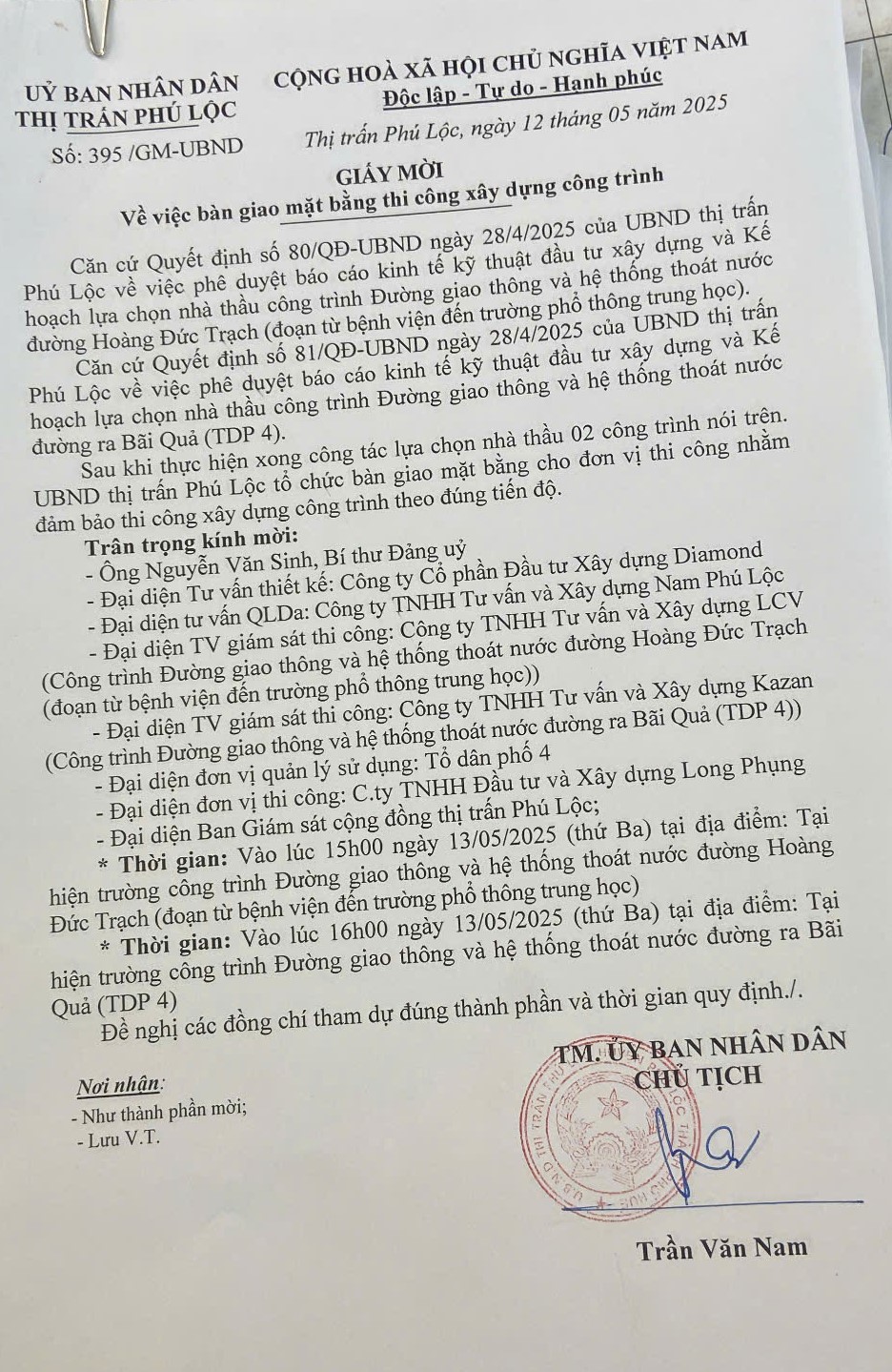 Vậy, Ủy ban nhân dân thị trấn Phú Lộc thông báo cho Ông/Bà được biết.