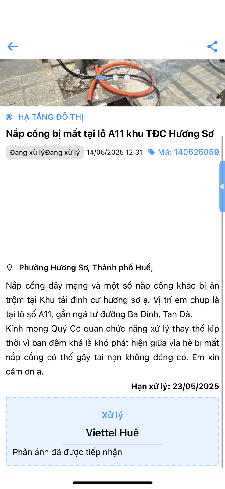 Dạ trước đây em có gửi phản ánh về việc mất nắp cống cáp quang, phía cơ quan chức năng đã chuyển giao cho viettel huế xử lý nhưng đến nay vẫn chưa được xử lý ạ. Em gửi phản ánh lại kính mong Quý Cơ quan chức năng sớm xử lý giúp em. Dạ em cảm ơn ạ