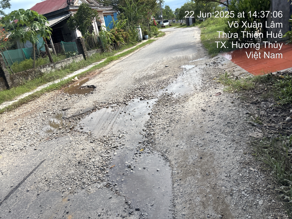 Kiến nghị sửa chữa đường Võ Xuân Lâm từ ngã ba Nguyễn Trọng Thuật đến Trần Hoàn, Xã Thủy Tân do hư hỏng nặng, khu vực đông dân cư sinh sống, đường ổ gà ổ voi bguy hiểm.