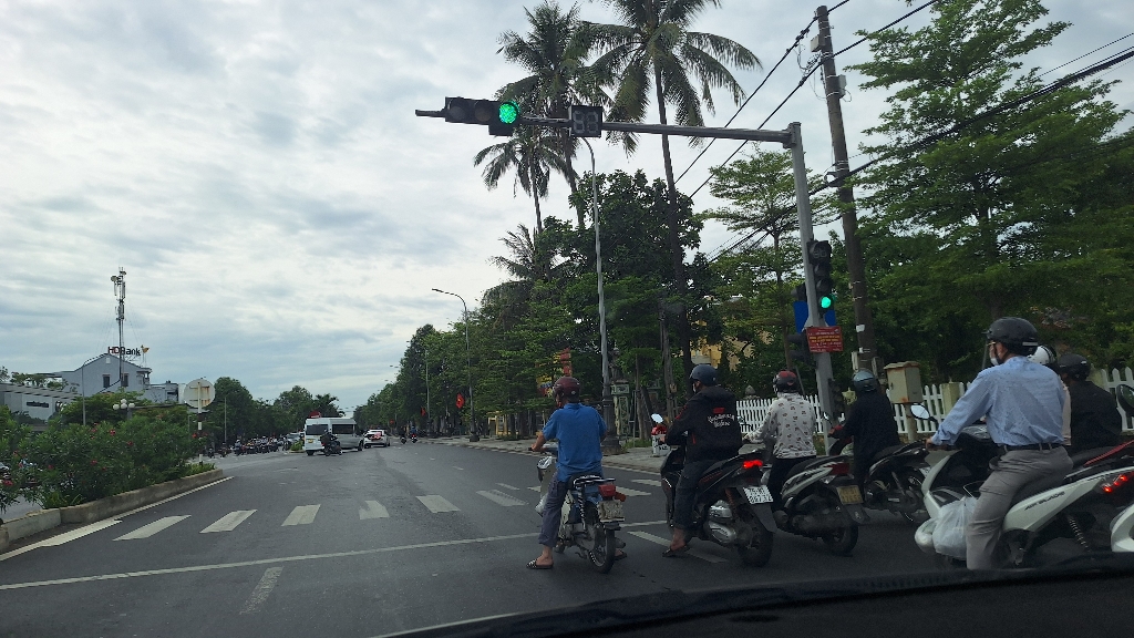 Hệ thống đèn giao thông tại ngã tư cầu Vượt Thủy Dương (hướng An Cựu về Hương Thủy) đèn màu vàng và màu đỏ không sáng.