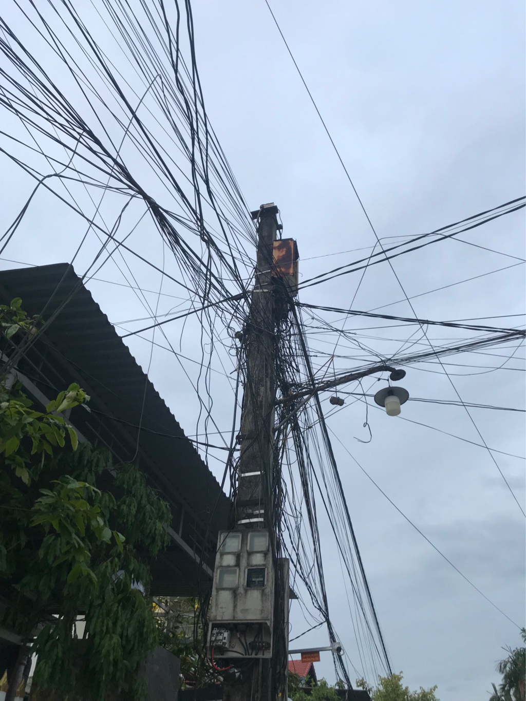 Hệ thống dây điện thắp sáng và dây mạng chằng chịt, dây không sử dụng cắt, cột lung tung. Đề nghị xử lí gọn gàng lại, tại trước số nhà 25A đường Đinh Lễ, phường Phú Bài, thành phố Huế. Ảnh và video chụp vào sáng ngày 03/7/2025