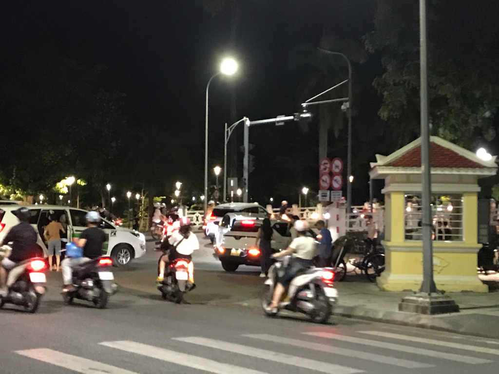 Ngã tư Lê Lợi - Hùng Vương lúc 22h ngày 10/7/2025. Mùa du lịch nên người và phương tiện lưu thông vẫn còn đông đảo. Tuy nhiên, đèn tín hiệu giao thông đã ngừng hoạt động điều tiết mà chuyển sang màu vàng cảnh báo, gây nên tình trạng hỗn loạn khi nhiều phương tiện đón trả khách tại nút giao cầu Trường Tiền. Các phương tiện lưu thông cũng không có đèn tín hiệu nên cũng hết sức nguy hiểm vì nằm ngay ngã tư. Đề nghị cho bật đèn tín hiệu muộn hơn cho dân nhờ.