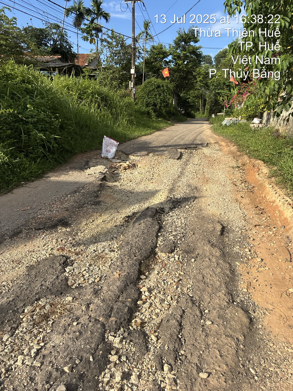 UBND phường Thủy Xuân nhận được đơn phản ánh từ trung tâm điều hành Đô thị thông minh HueS về việc kiến nghị sửa chữa đường ĐT7, phường Thủy Bằng, Quận Thuận Hóa, thành phố Huế (cũ), nay phường Thủy Xuân hư hỏng nghiêm trọng gây nguy hiểm cho người dân.