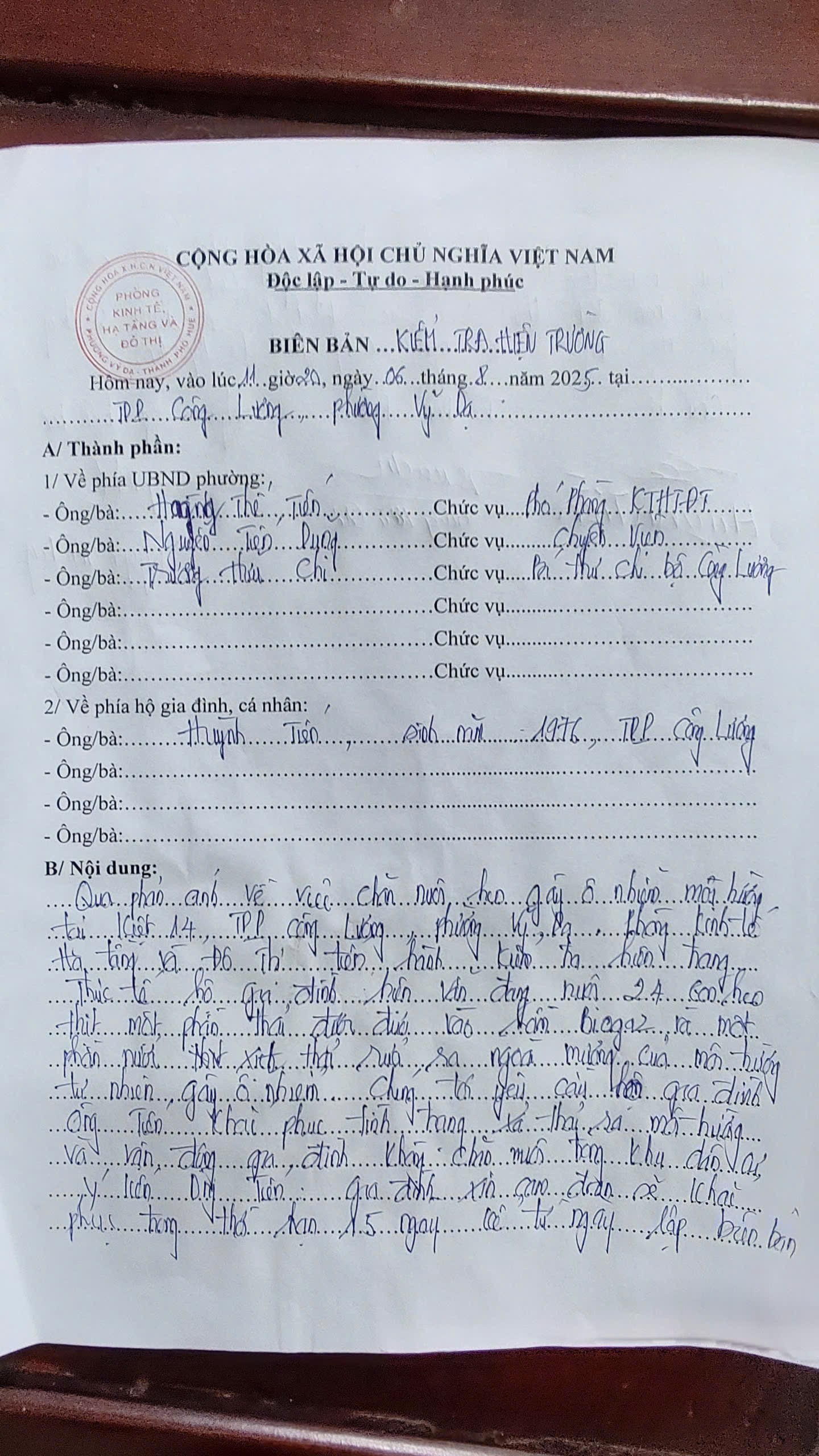 UBND phường đã cử lực lượng chức năng cùng các đồng chí cán bộ cốt cán tổ dân phố tiến hành kiểm tra xử lý theo nội dung phản ánh. Ông Huỳnh Tiến có trình bày là gia đình có hầm Bioga nên đa phần phân heo sẽ chảy vào hầm, còn khi xịt rửa chuồng thì nước có chảy ra bên ngoài gây mất vệ sinh. Ủy ban nhân dân phường đã yêu cầu gia đình ông Huỳnh Tiến không được xả nước thải gây mất vệ sinh môi trường như phản ánh của người dân. Gia đình ông Huỳnh Tiến xin cam đoan sẽ tiến hành các giải pháp khắc phục sự việc trong vòng 15 ngày kể từ ngày làm biên bản..(Đính kèm biên bản làm việc)