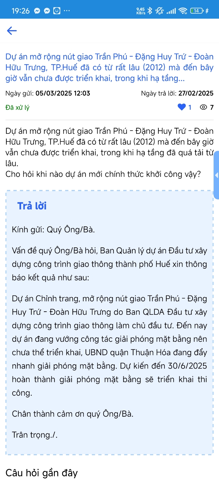 Vấn đề quý Ông/Bà hỏi, Ban Quản lý dự án Đầu tư xây dựng công trình giao thông thành phố Huế xin thông tin như sau: