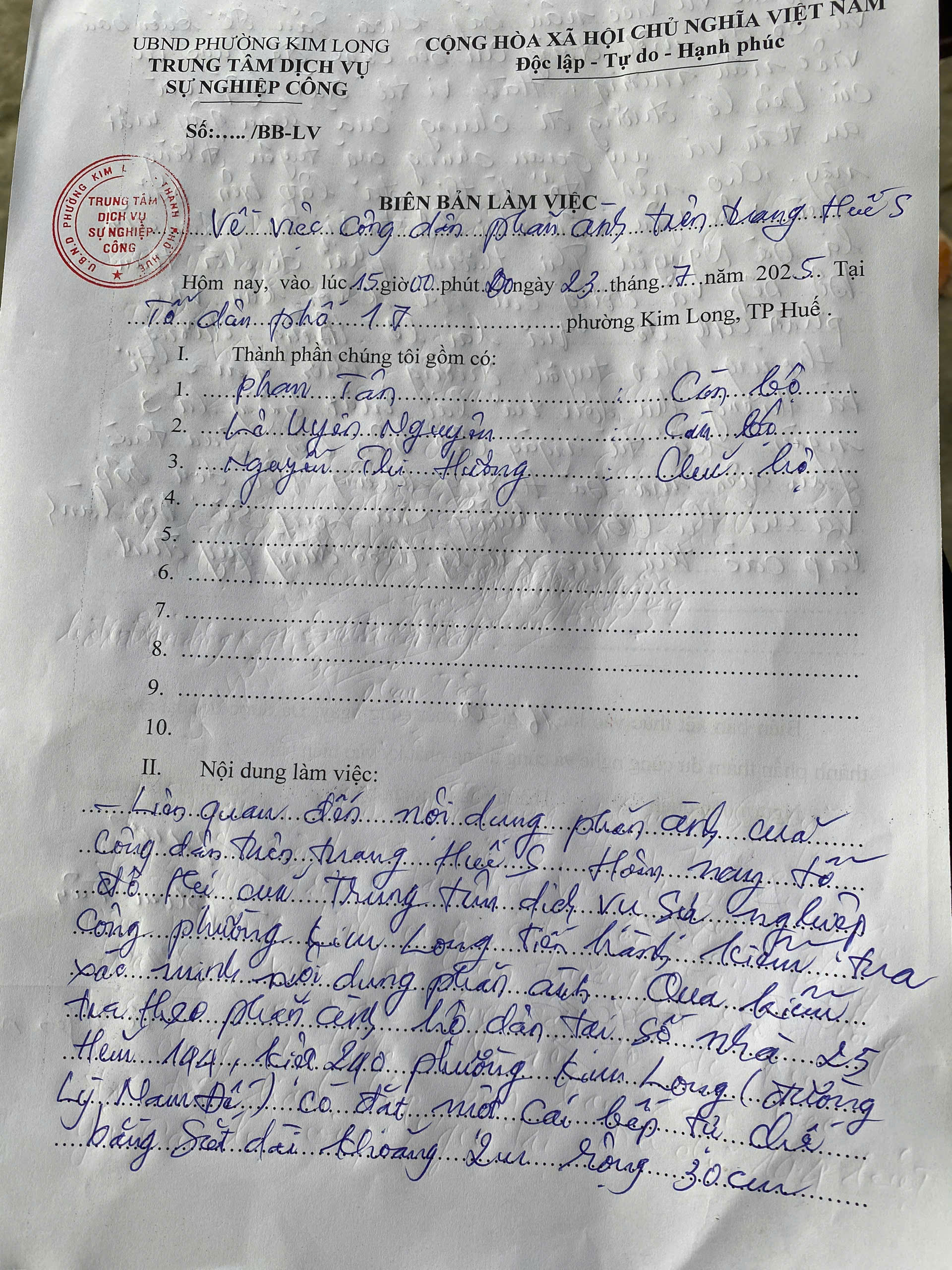 UBND phường Kim Long đã lập biên bản làm việc yêu cầu ông N, bà N.T.H khắc phục tình trạng trên và ông N, bà N.T.H hứa sẽ khắc phục và nếu tái phạm sẽ chịu trách nhiệm trước pháp luật (có biên bản kèm theo).