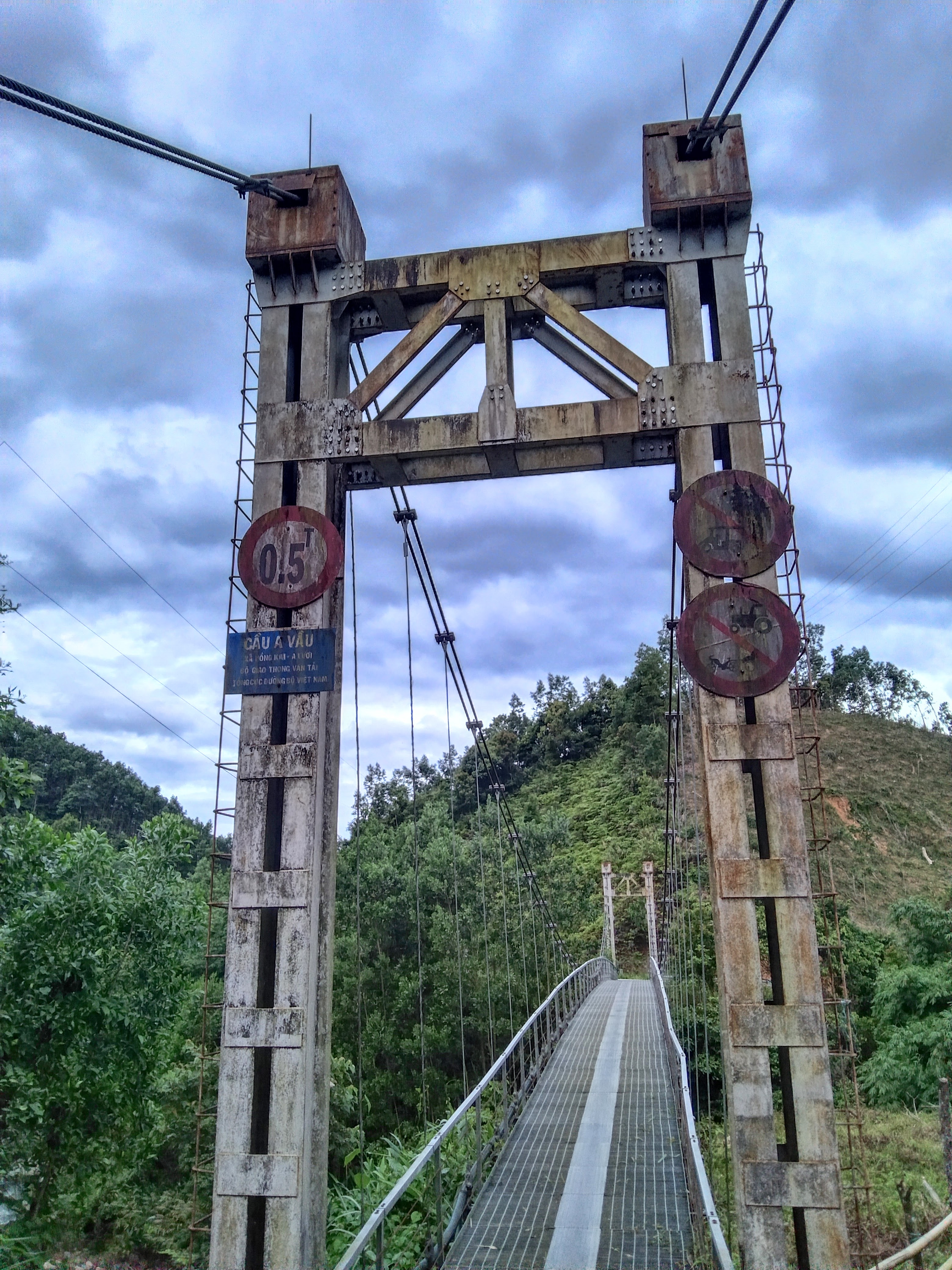 Bảng tên cầu, các biển báo trên cầu A Vầu trên đường vào Khu du lịch sinh thái A Nô qúa cũ, bong tróc, cần phải thay mới. Ảnh chụp lúc 18h28 ngày 23/7/2025 tại hiện trường làng Việt Tiến A Nô xã A Lưới 1