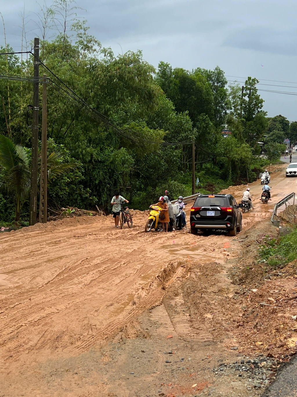 Đơn vị thi công mở đường tạm, không rải đá, mặt đường sình lầy, phương tiện đi lại rất khó khăn, xe máy dắt bộ.