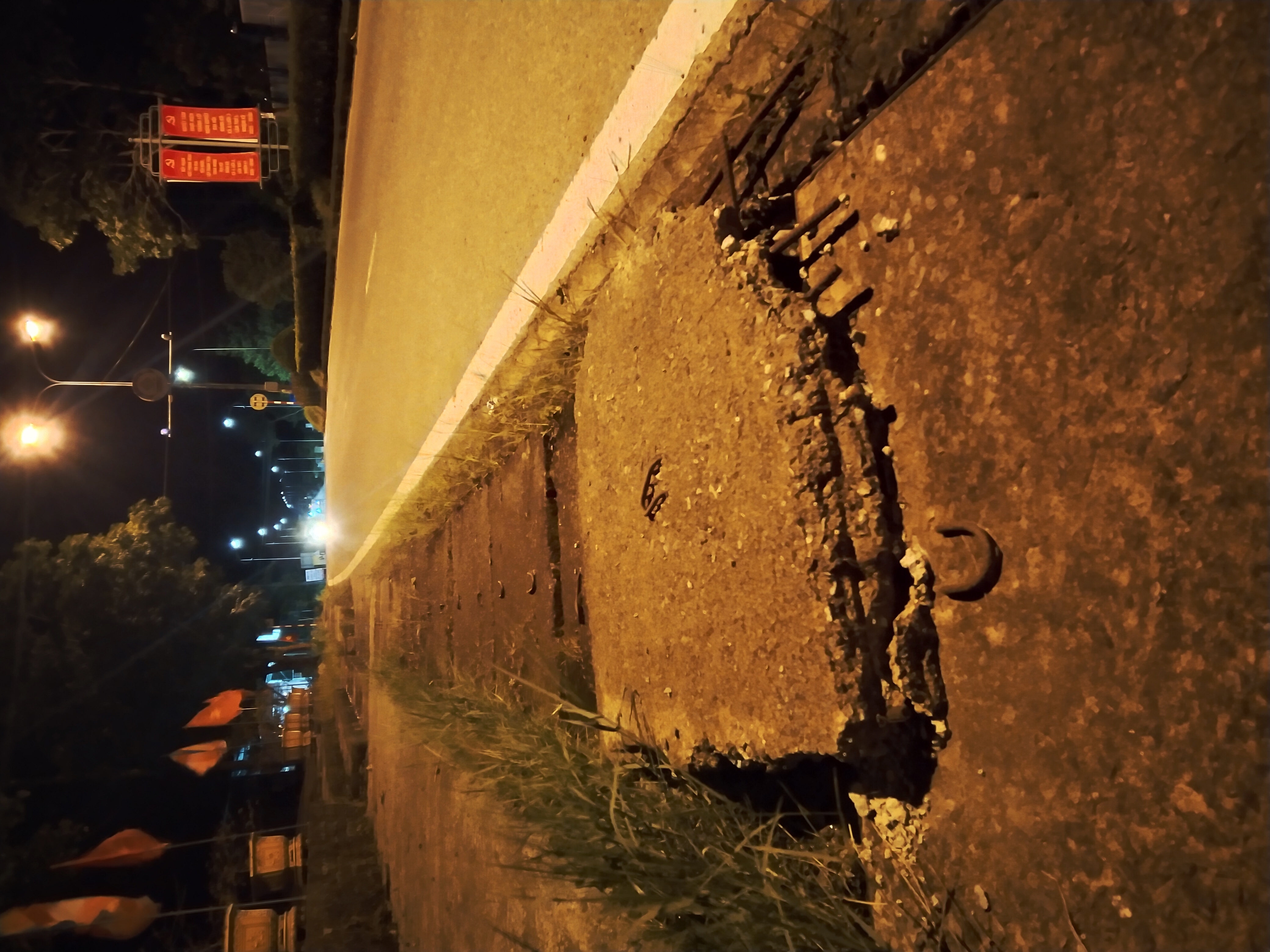 Một tấm đoanh trên đường Hồ Chí Minh ngay trước Niệm Phật đường Sơn Thủy bể lòi cả sắt, nổi cao trên lề đường, rất nguy hiểm cho người đi đường. Cách đó về hướng bắc khoảng 100 mét là một cái nắp cống hỏng đã lâu nên người dân lót tạm tấm ván để qua lại. Tấm ván này cũng đã có dấu hiệu mục. Ảnh chụp tại hiện trường lúc 19h20 ngày 27/7/2025 thôn Quảng Hợp, xã Sơn Thủy cũ, nay thuộc xã A Lưới 3.