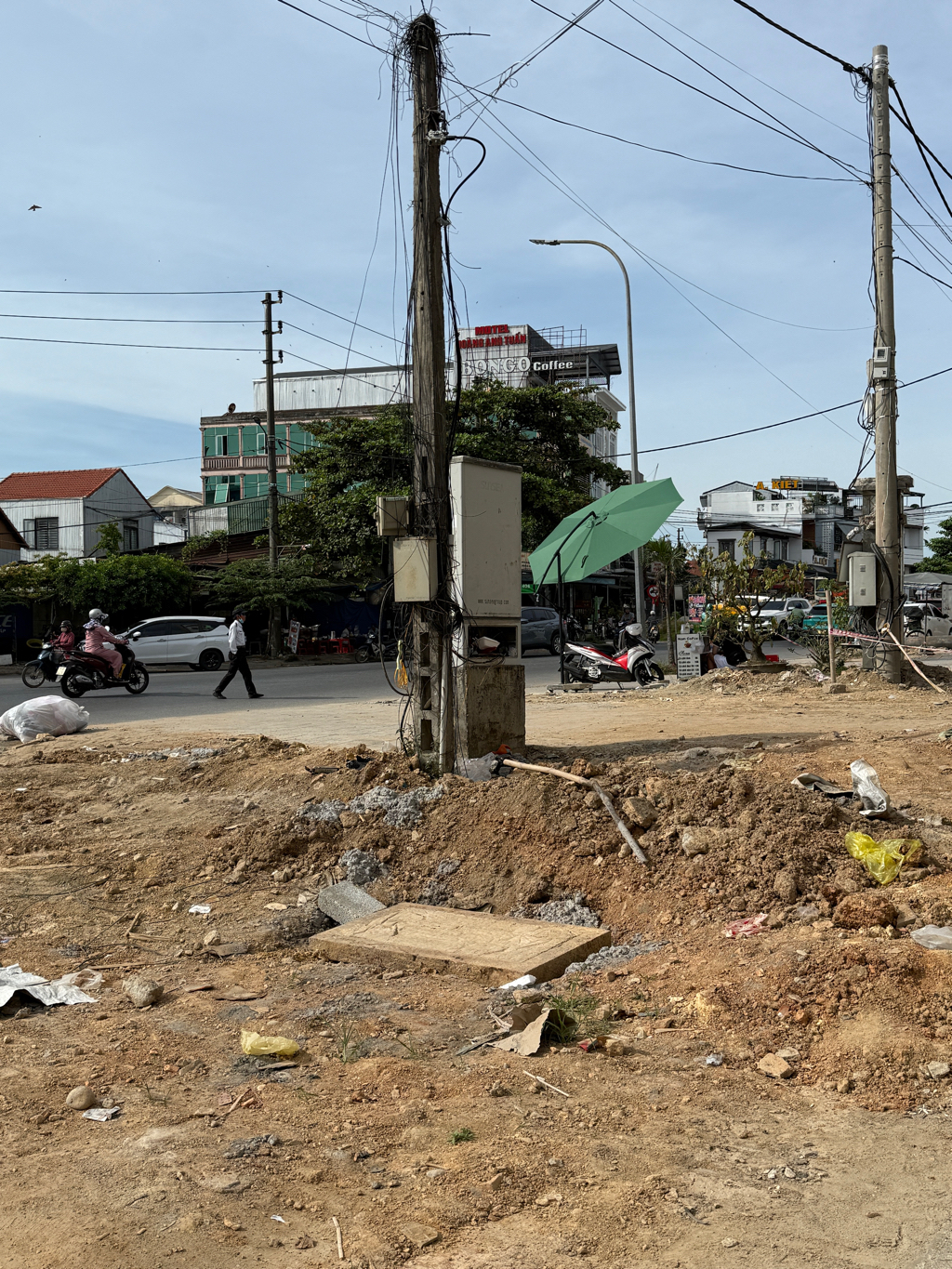 Mưa xuống rất lầy lội, đi trơn trượt. Nắng thì bụi bặm, vẫn còn hố, đường dây nhếch nhác. Ảnh được chụp sáng 6h ngày 5/8/2025.