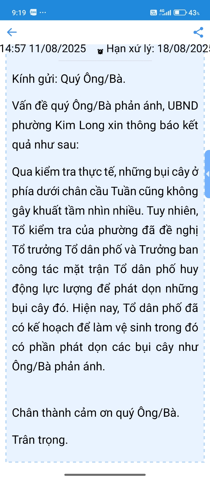 Vấn đề quý Ông/bà phản ánh, UBND phường Kim Long xin thông báo kết quả xử lý như sau: