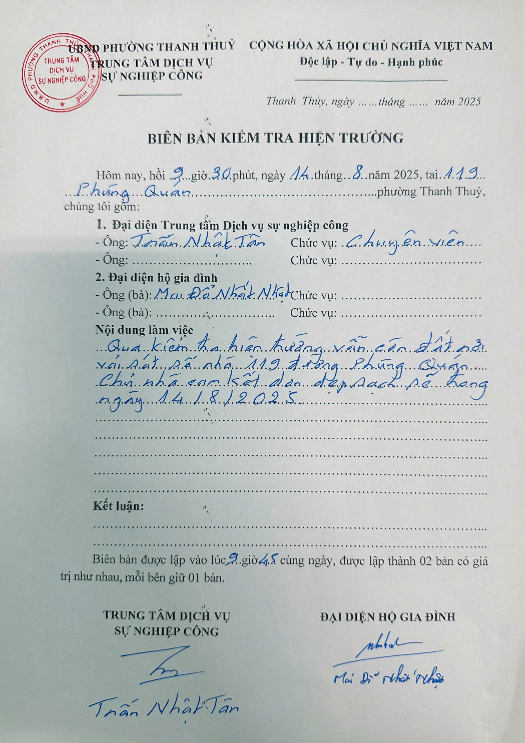 Sau khi nhận phản ánh, UBND phường đã chỉ đạo Trung tâm Dịch vụ sự nghiệp công giải quyết. Qua kiểm tra hiện trường công trình đào đất đã ngừng thi công. Trung tâm Dịch vụ sự nghiệp công đã yêu cầu chủ nhà dọn dẹp sạch sẽ trong ngày 14/8/2025 (có biên bản kèm theo).