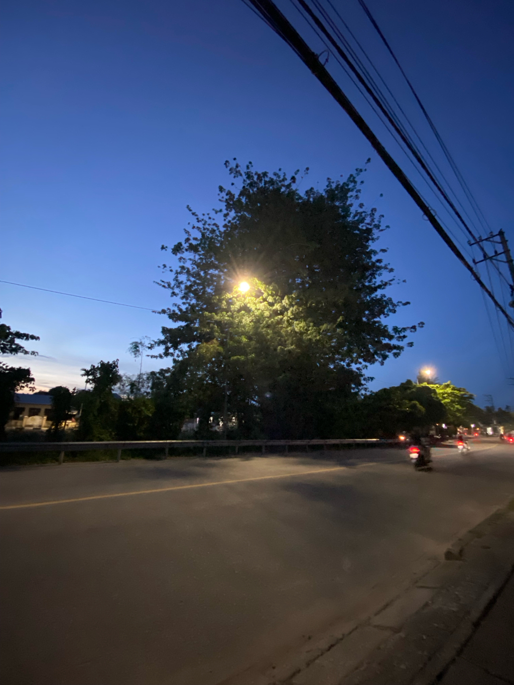 Cây xanh che khuất bóng đèn đường. Cây cột đèn đối diện quán gạch men Thế Lực bị che khuất bởi cành cây khiến tầm ánh sáng bị hạn chế. Kính mong cơ quan chỉ đạo cắt tỉa lấy ánh sáng. Ảnh chụp vào ngày 19/8/2025 lúc 18h30. Địa chỉ: xóm 16, thôn Trung Đông, phường Mỹ Thượng, TP Huế.