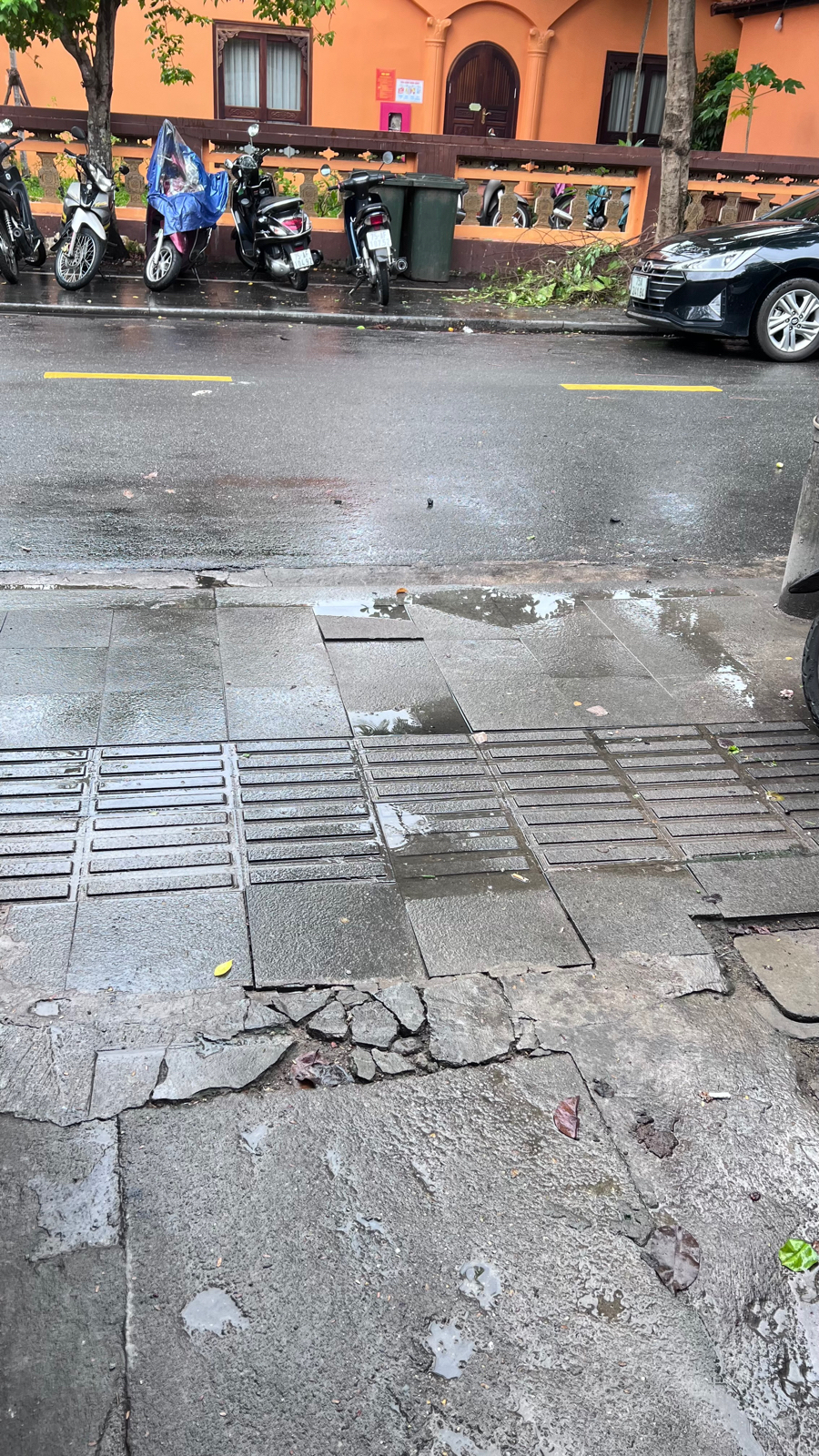 Vỉa hè bị hư hại tại kiệt 68 Đặng Dung, phường Phú Xuân, thành phố Huế. Ảnh chụp lúc 12:05 ngày 25/8/2025. Đề nghị cơ quan chức năng kiểm tra và xử lý.