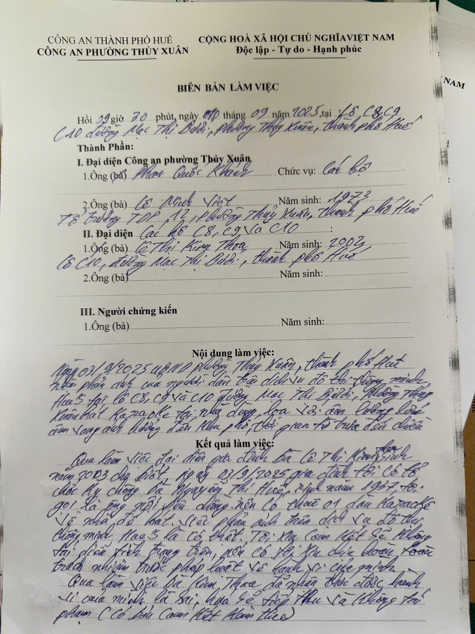 Qua nội dung phản ảnh của ông, bà. Cảnh sát khu vực đã đến làm việc với đại diện gia đình bà Lê Thị Kim Thoa, bà Thoa trao đổi là gia đình có tổ chức kỵ ông nội chồng và có thuê 01 dàn Karaoke về để hát và việc phản ánh trên Hue’s là có thật. Bà Thanh xin cam đoan cam kết sẽ không tái diễn tình trạng trên. Qua buổi làm việc bà Thoa nhận thức được hành vi của mình là sai, hứa sẽ tiếp thu và không tái phạm