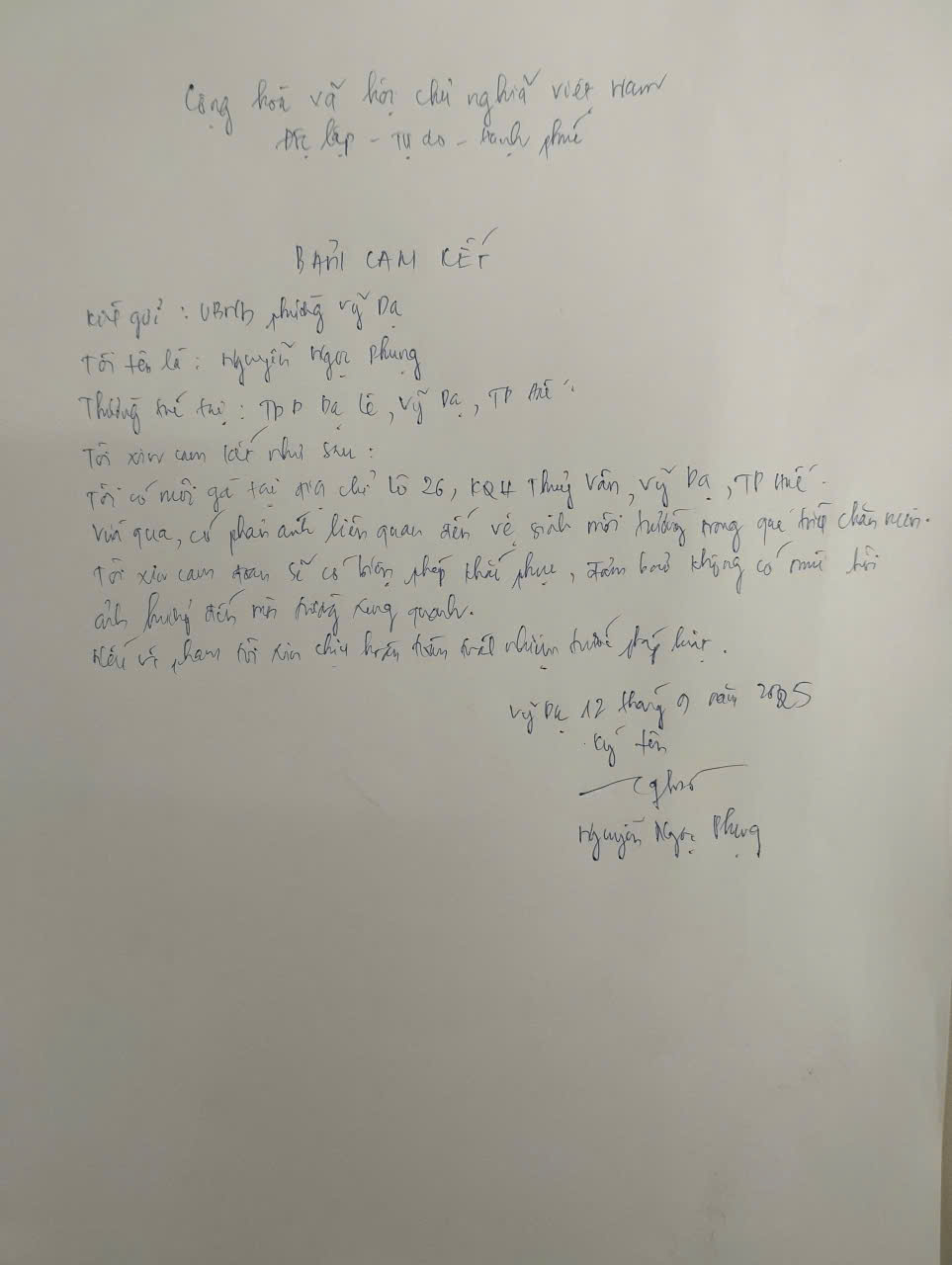 Qua kiểm tra, phát hiện bà Nguyễn Ngọc Phụng có nuôi gà tại địa chỉ Lô 26, KQH Thủy Vân, phường Vỹ Dạ. Bà Phụng đã cam kết sẽ thực hiện các biện pháp khắc phục, đảm bảo không để phát sinh mùi hôi gây ảnh hưởng đến môi trường và các hộ dân xung quanh (đính kèm bản cam kết).