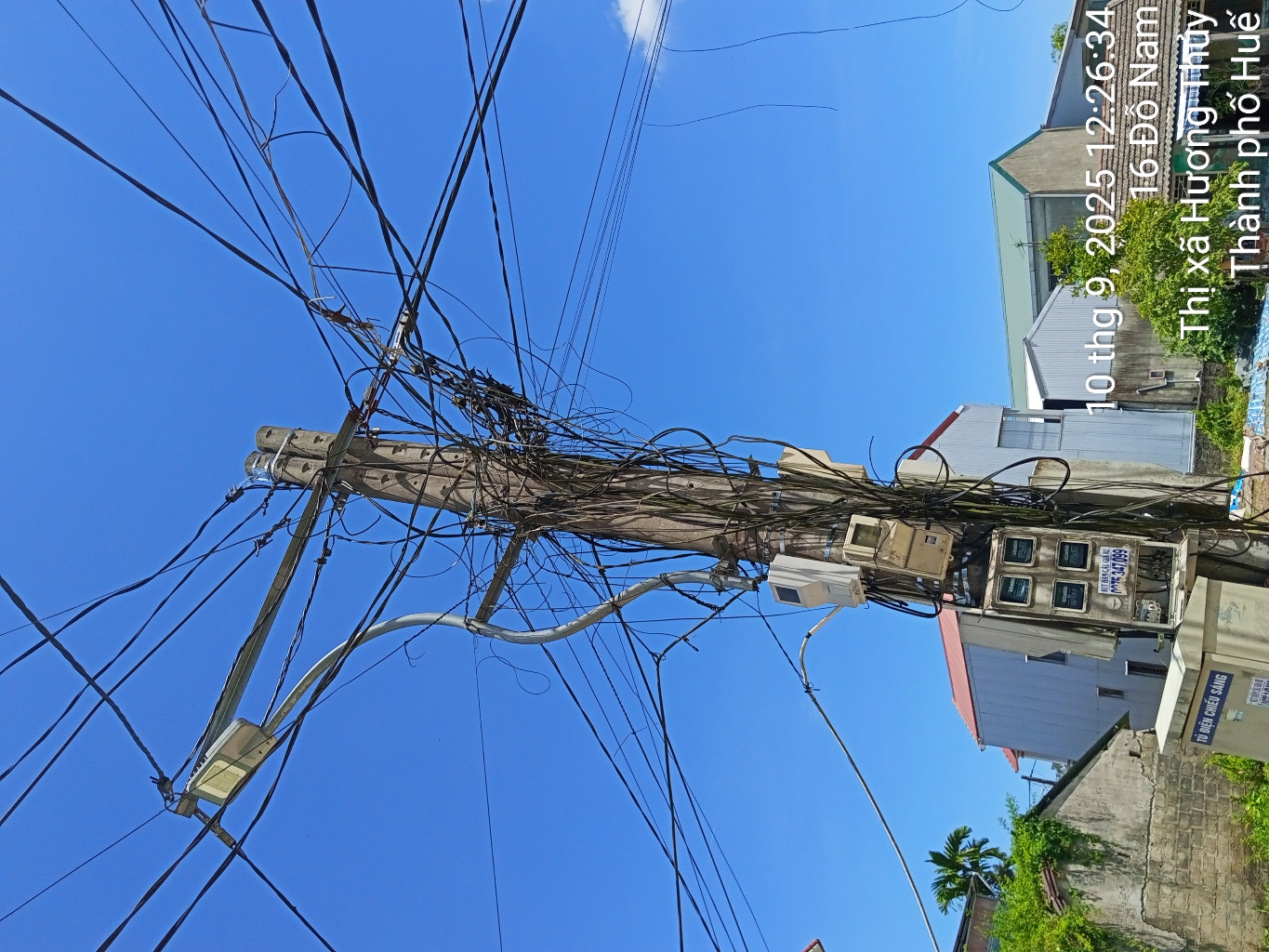 Dây điện chiếu sáng và hộ gia đình xà xuống đường nhiều ngày chưa xử lý. Rất nguy hiểm cho người dân vào mùa mưa gió, ảnh hưởng đến giao thông qua lại. Dây điện hộ gia đình lâu năm bong tróc rất nguy hiểm. Nhờ chính quyền địa phương, ban nghành có liên quan xử lý sớm trả lại vẻ mỹ quan và an toàn cho người dân khu vực này. Trước mặt nhà 16 Đỗ Nam, Phường Phú Bài, TP Huế
