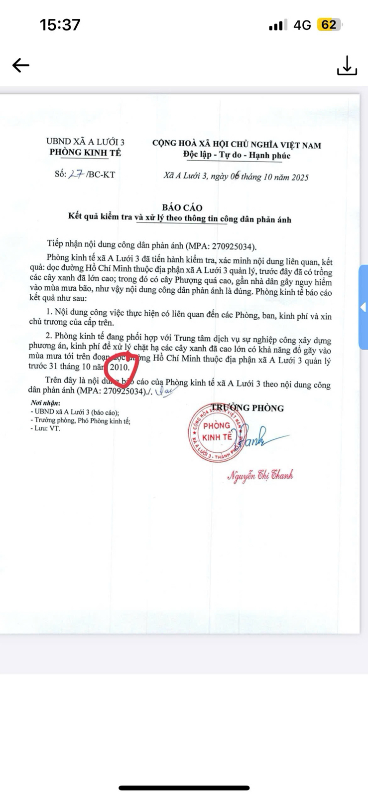 Phòng Kinh tế xã A Lưới 3 đã ban hành Báo cáo số 27/BC-KT ngày 06 tháng 10 năm 2025 về việc kiểm tra và xử lý thông tin công dân phản ánh gửi xã A Lưới 3. (Đính kèm hình ảnh)