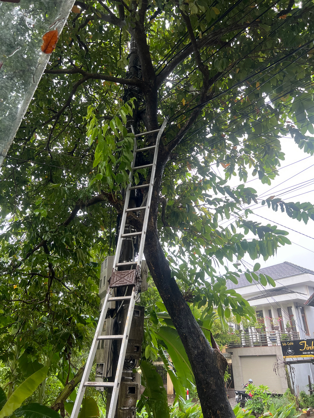 Cây xanh che trụ điện có nguy cơ làm gãy trụ điện, vị trí 110 Đào Duy Tùng, phường Mỹ Thượng, TP Huế. Kính gửi cơ quan chức năng kiểm tra xử lý.
