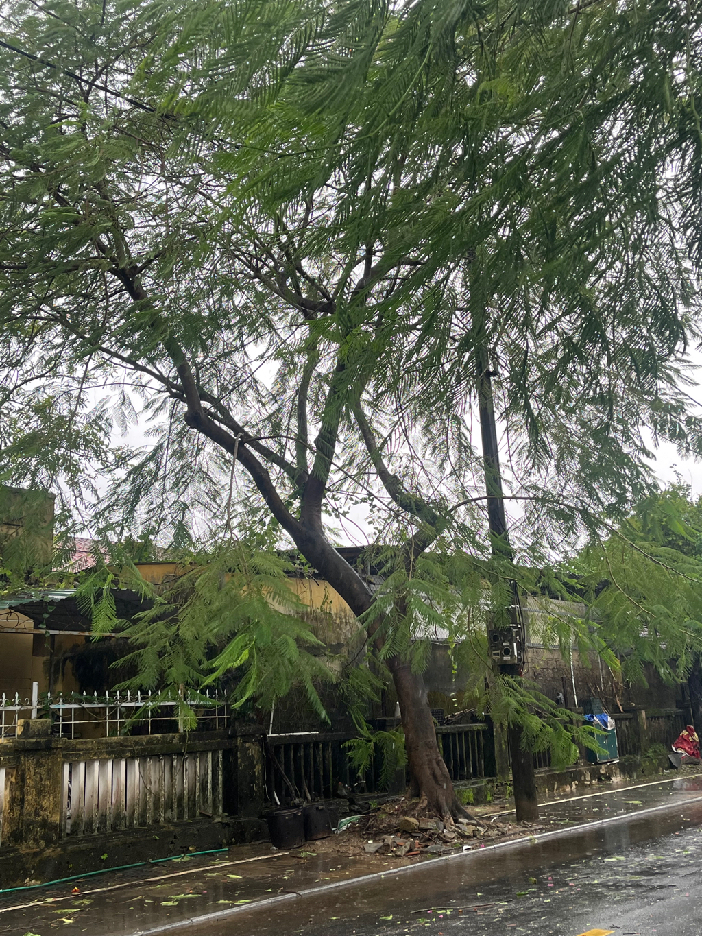 Kiến nghị đốn hạ hoặc cắt tỉa bớt cành cây cao ở 67 Đặng Dung, phường Phú Xuân (dãy 3 cây liên tiếp nhau). Dây điện cọ vào cành cây kin kít dễ gây nguy hiểm. Hình ảnh quay chụp lúc 13h30 ngày 28/9/2025.