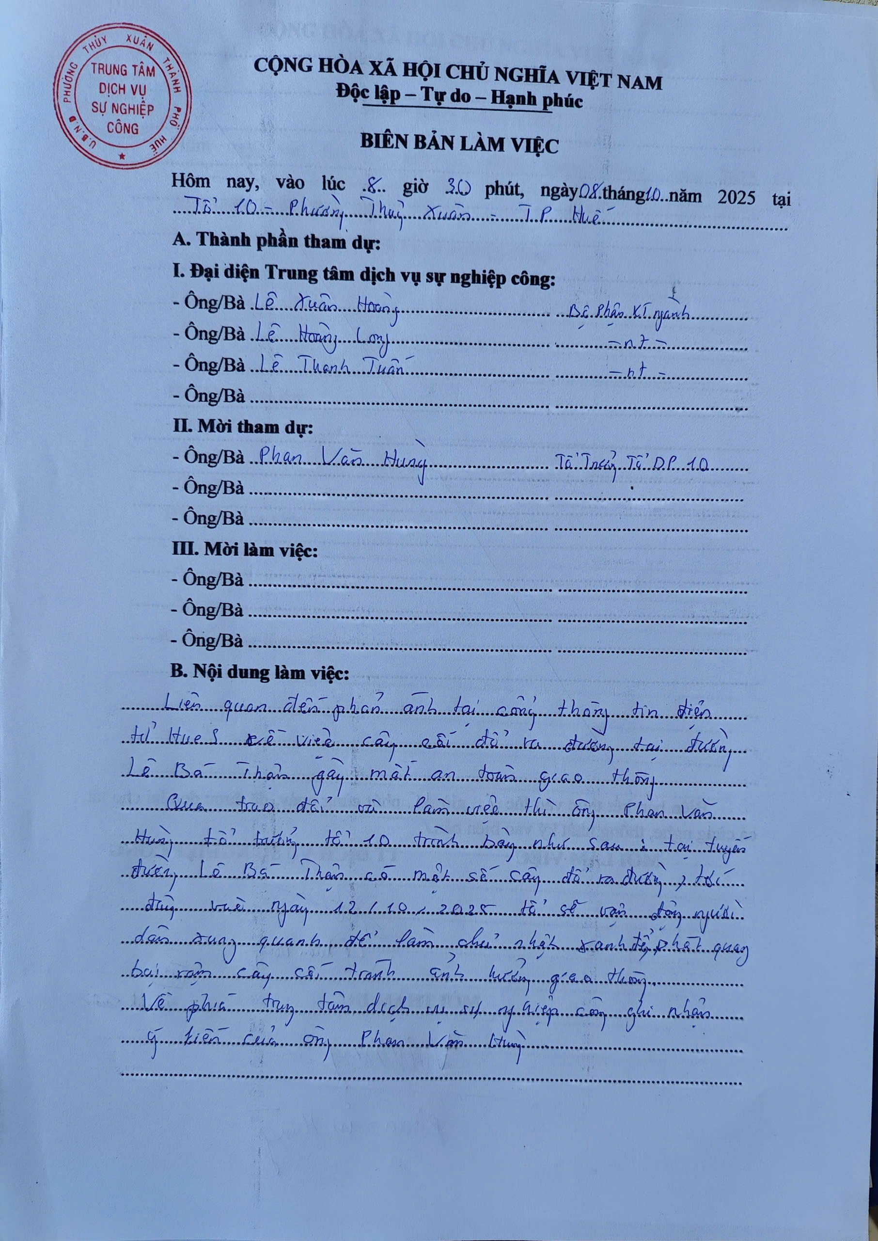 Qua trao đổi và làm việc với Tổ trưởng TDP 10 trình bày, tại tuyến đường này có nhiều cây gẫy đổ ra đường chủ nhật tuần này (12/10/2025) tổ sẽ vận động làm chủ nhật xanh để phát quang dọn dẹp để mọi người dân lưu thông thuận tiện.