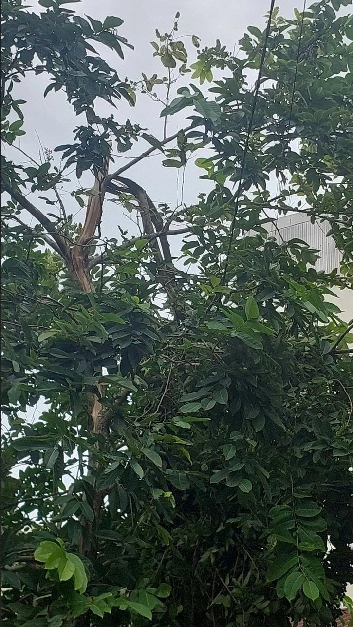 Cây xanh gãy đổ đè lên dây điện hạ thế gây mất an toàn điện và nguy hiểm cho người dân tại vị trí đối diện số nhà 165 Phan Văn Trường, Vỹ Dạ.