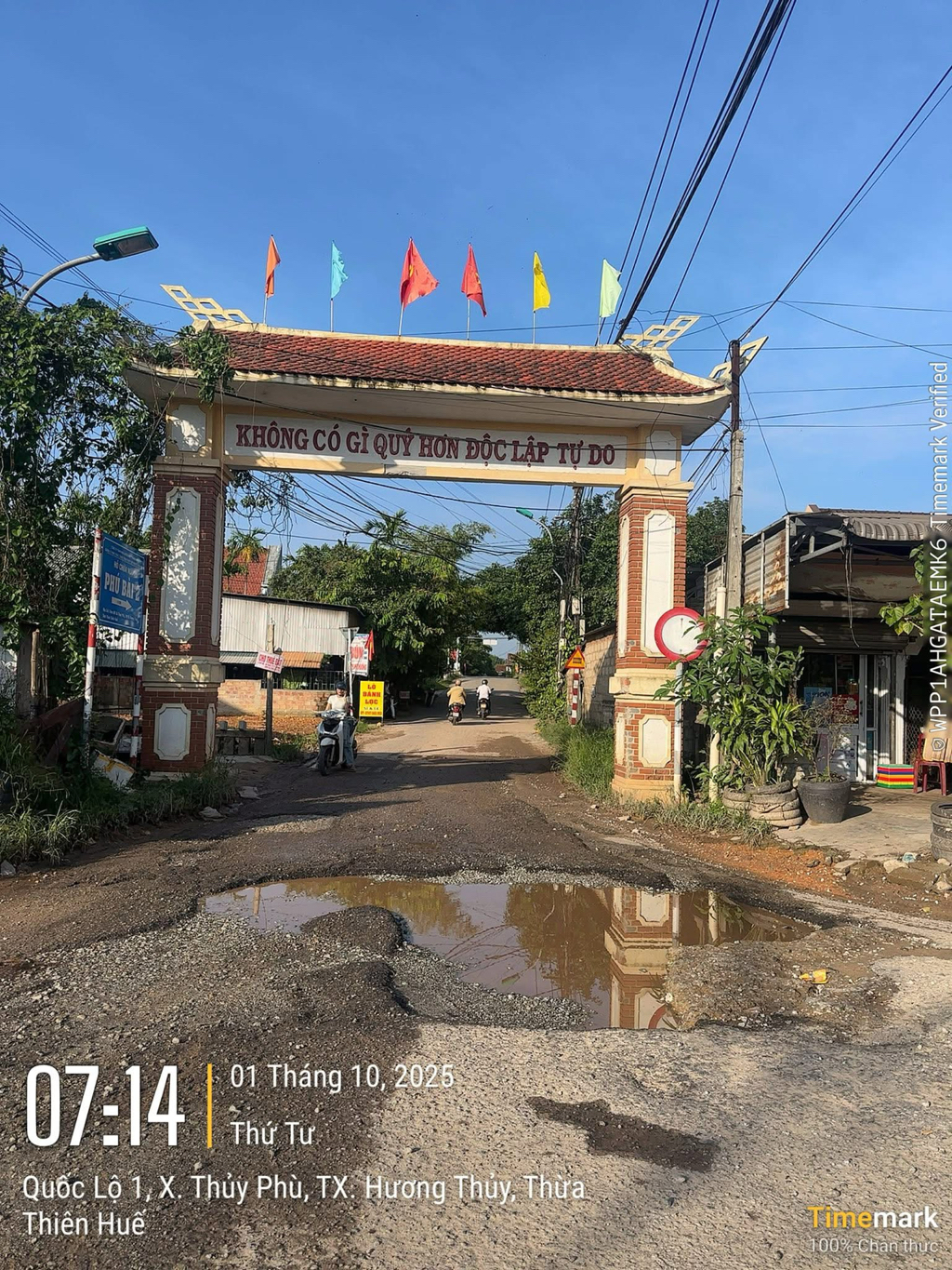 Đường xuống cấp, ổ gà ổ voi lớn. Người dân qua lại ngã xe rất nhiều, khi vào mùa mưa đọng nước không đi lại được vì rất dễ gây ra tai nạn, hơn 1 năm rồi mà vẫn chưa thấy cơ quan nào khắc phục. Tại cổng chào tổ dân phố 8A, phường Phú Bài, Thành phố Huế.