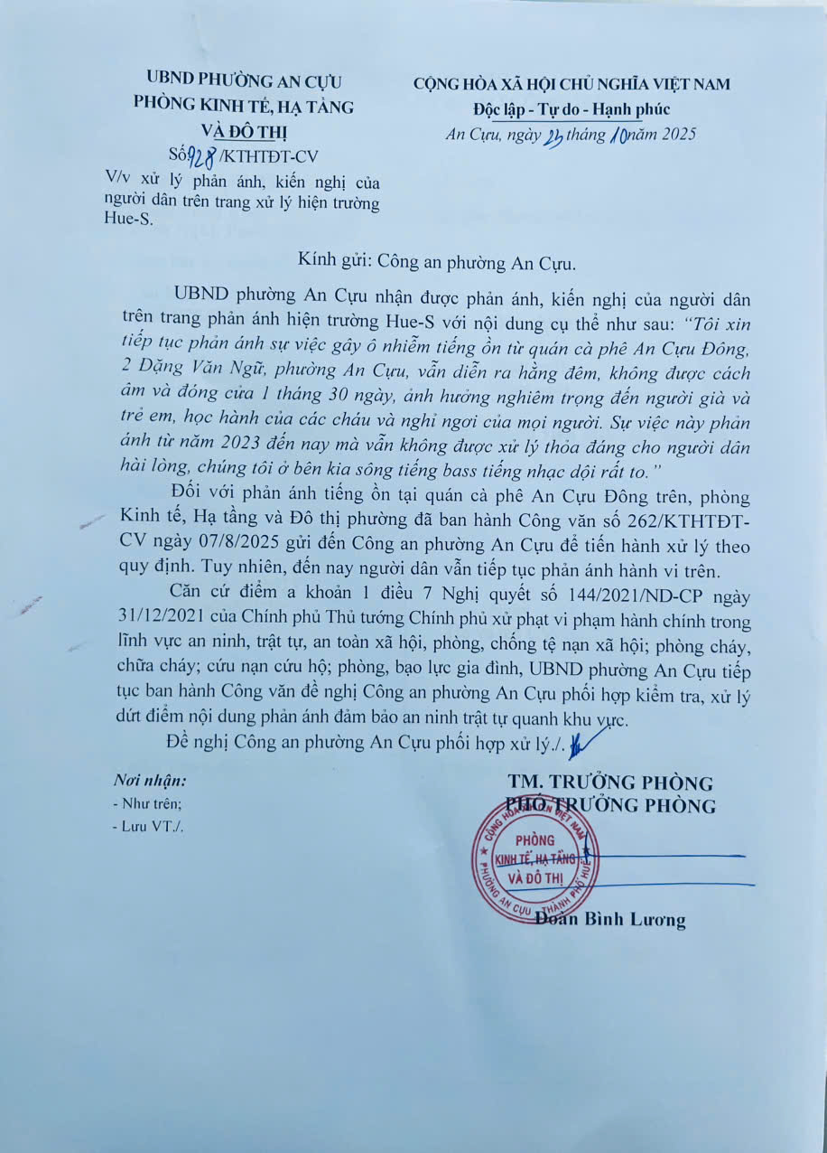 Tôi xin tiếp tục phản ánh sự việc gây ô nhiễm tiếng ồn từ quán cà phê An Cựu Đông, 2 Đặng Văn Ngữ, phường An Cựu, vẫn diễn ra hằng đêm, không được cách âm và đóng cửa 1 tháng 30 ngày, ảnh hưởng nghiêm trọng đến người già và trẻ em, học hành của các cháu và nghỉ ngơi của mọi người. Sự việc này phản ánh từ năm 2023 đến nay mà vẫn không được xử lý thỏa đáng cho người dân hài lòng, chúng tôi ở bên kia sông tiếng bass tiếng nhạc dội rất to. Nay tôi tiếp tục phản ánh lên cơ quan chức năng, mong cơ quan chức năng xem xét xử lý mang lại công bằng cho người dân. Tôi xin cám ơn. Video được quay lúc 20h30 ngày 14/10/2025.